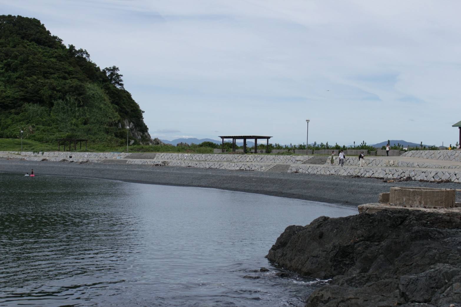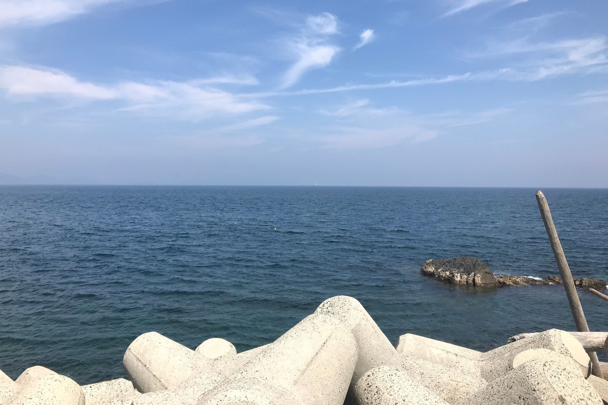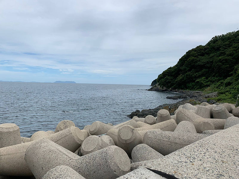 海水浴場とは反対側の堤防からの眺め。無数のテトラポットと青い海が広がる開放的な眺めはどこか人の心を癒す効果があるように感じます。夏場も海風を浴びて涼むことが出来ますが、日差しには充分に注意が必要です。