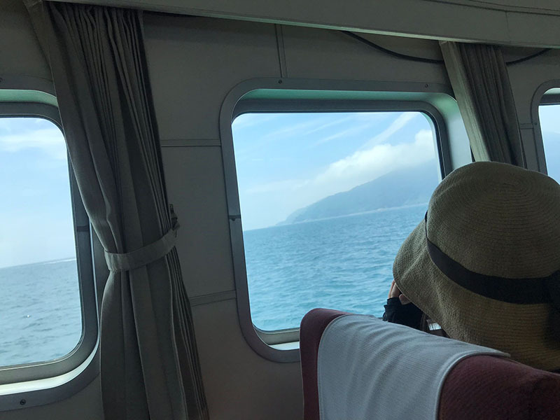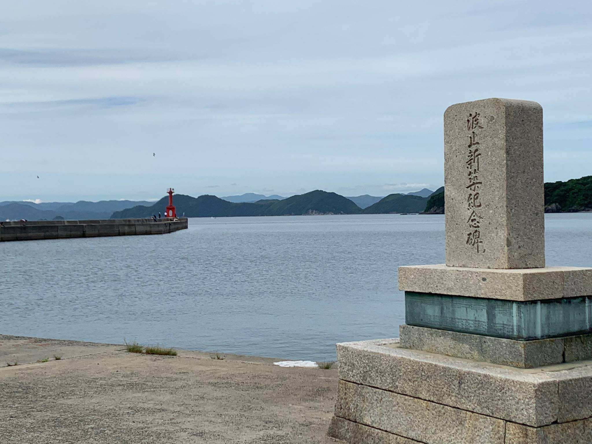 野島の岸を守るテトラポッドの向こう側には、雄大な海が広がっています。右手の青々とした野島の木々と遠くにうっすらと見える島との対比は、まるで桃太郎などの昔話の挿絵のような光景を見せてくれます。