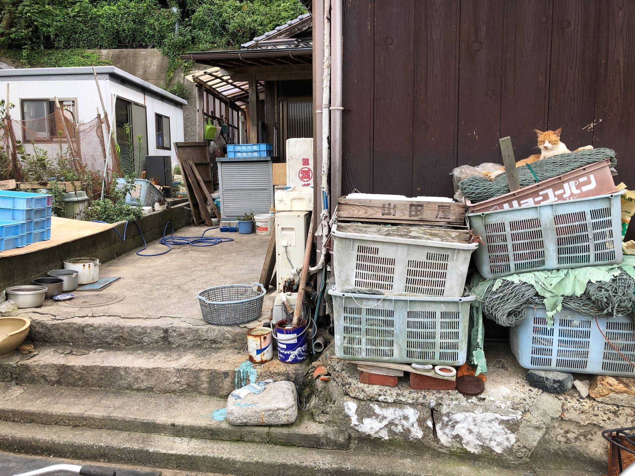 燈台へ向かう道で発見した廃屋です。山に向かうに連れてこのような廃屋(廃屋らしき建物)が目につくようになります。廃屋好きはなかなかマニアックですが、寂れた感じ、緑に飲まれる感じは、なんとも言えない味わいがあります。
