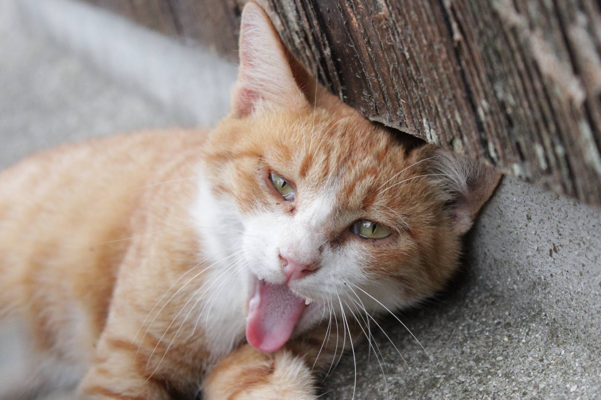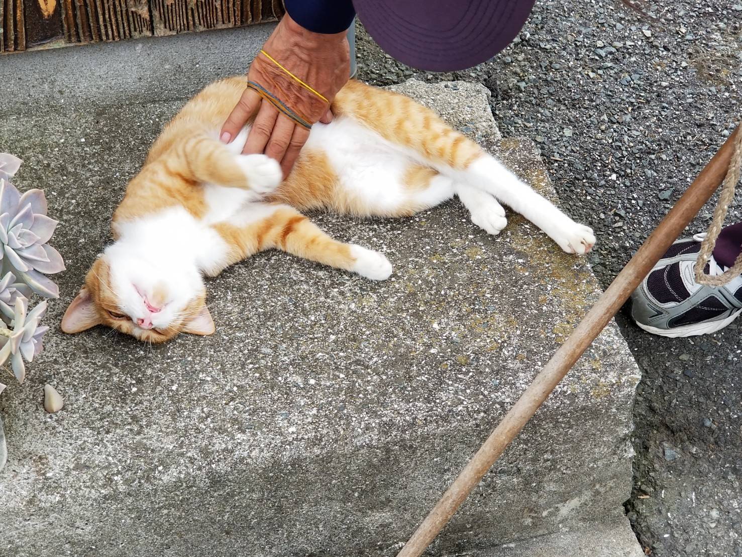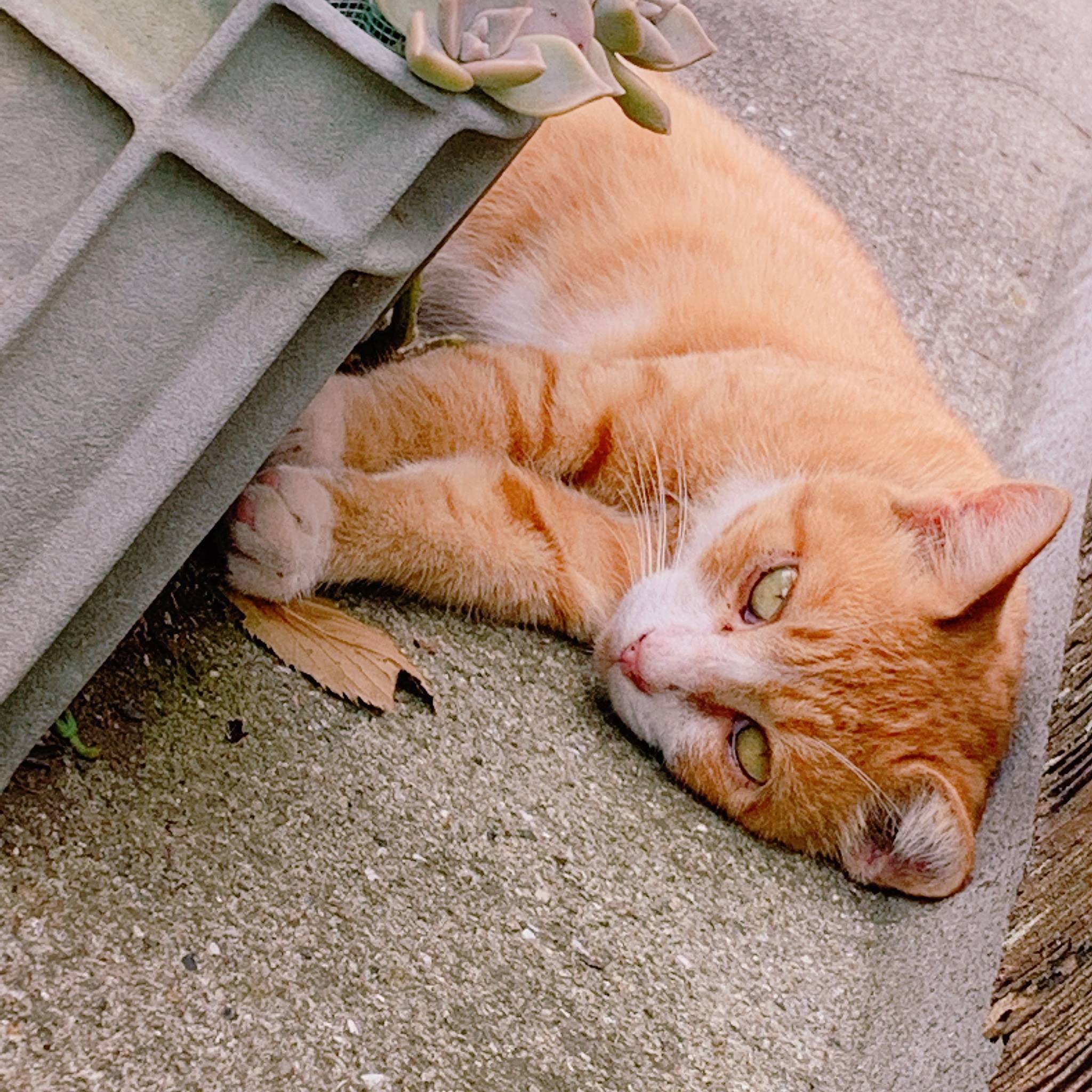 We found a cat sprawled in the gap between the wall and a planter. It didn’t run away when we approached, and even allowed us to pet it. It was a very kind cat.