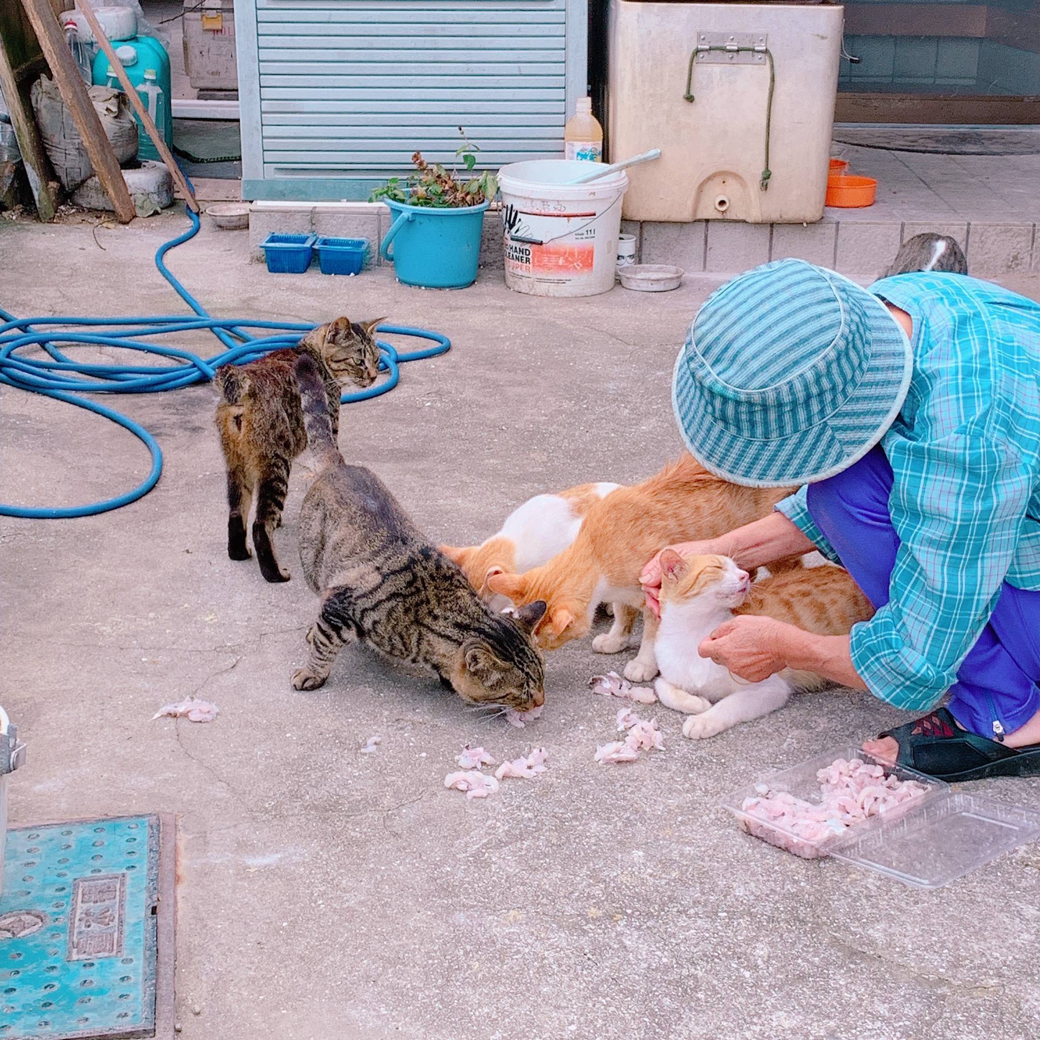 The cats in the photo were at a private house near the public hall. The resident of this private house was feeding the cats with rice. The islanders and the cats support each other and live together harmoniously.