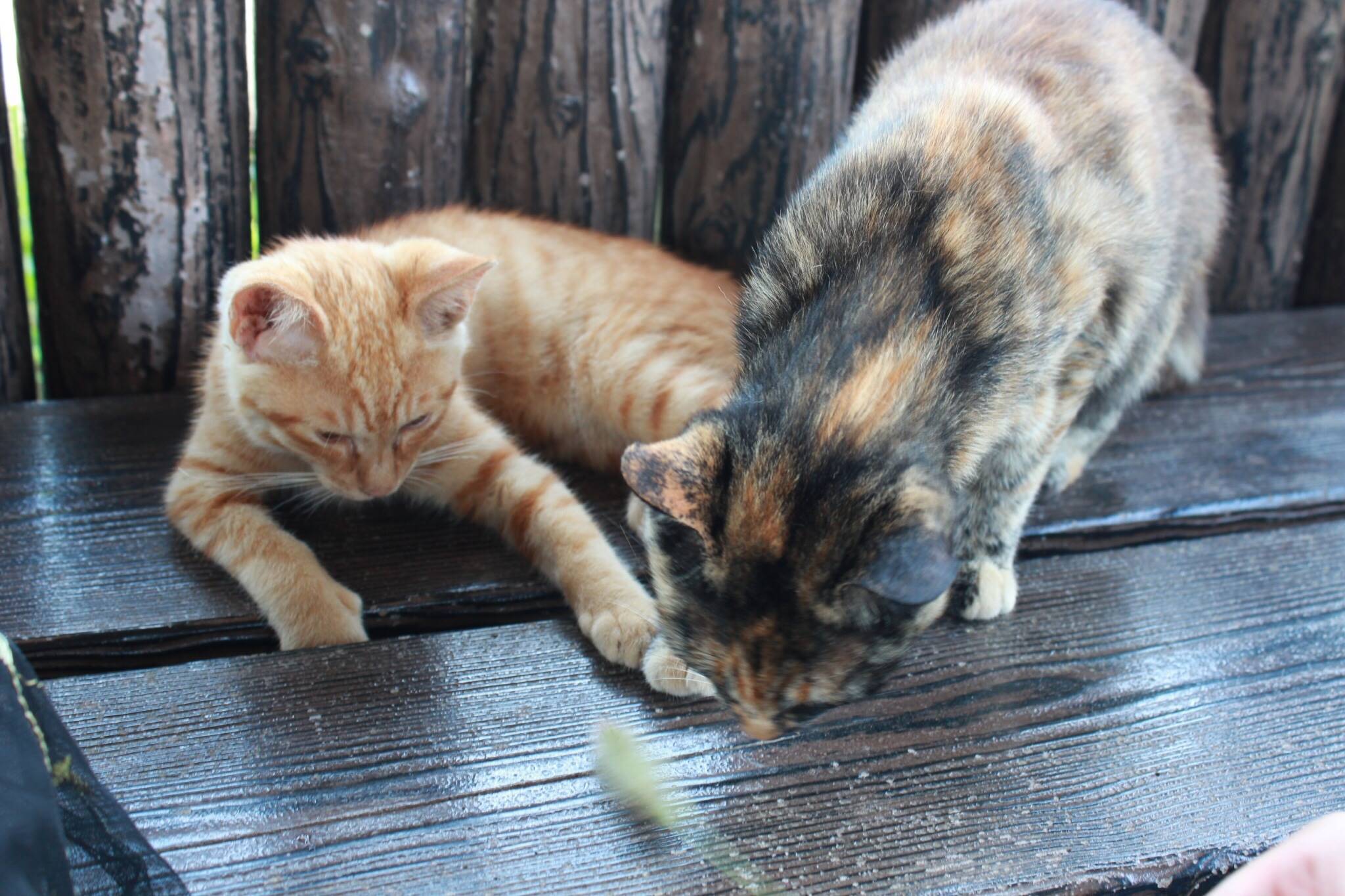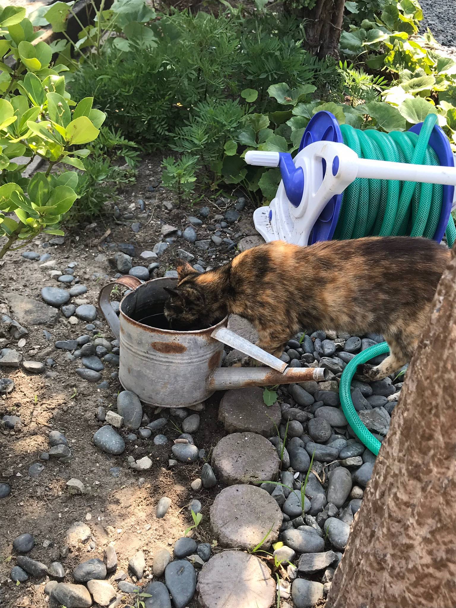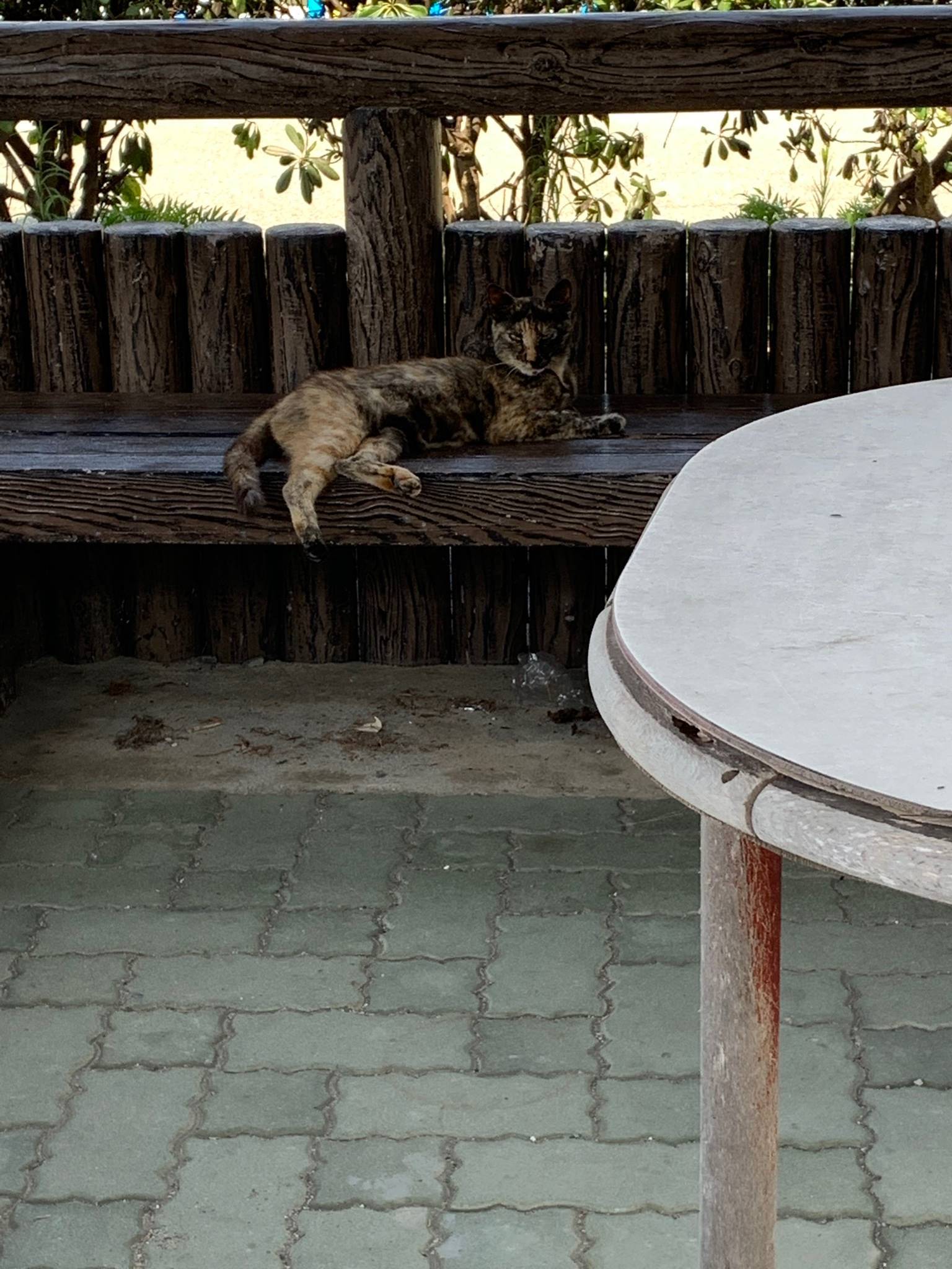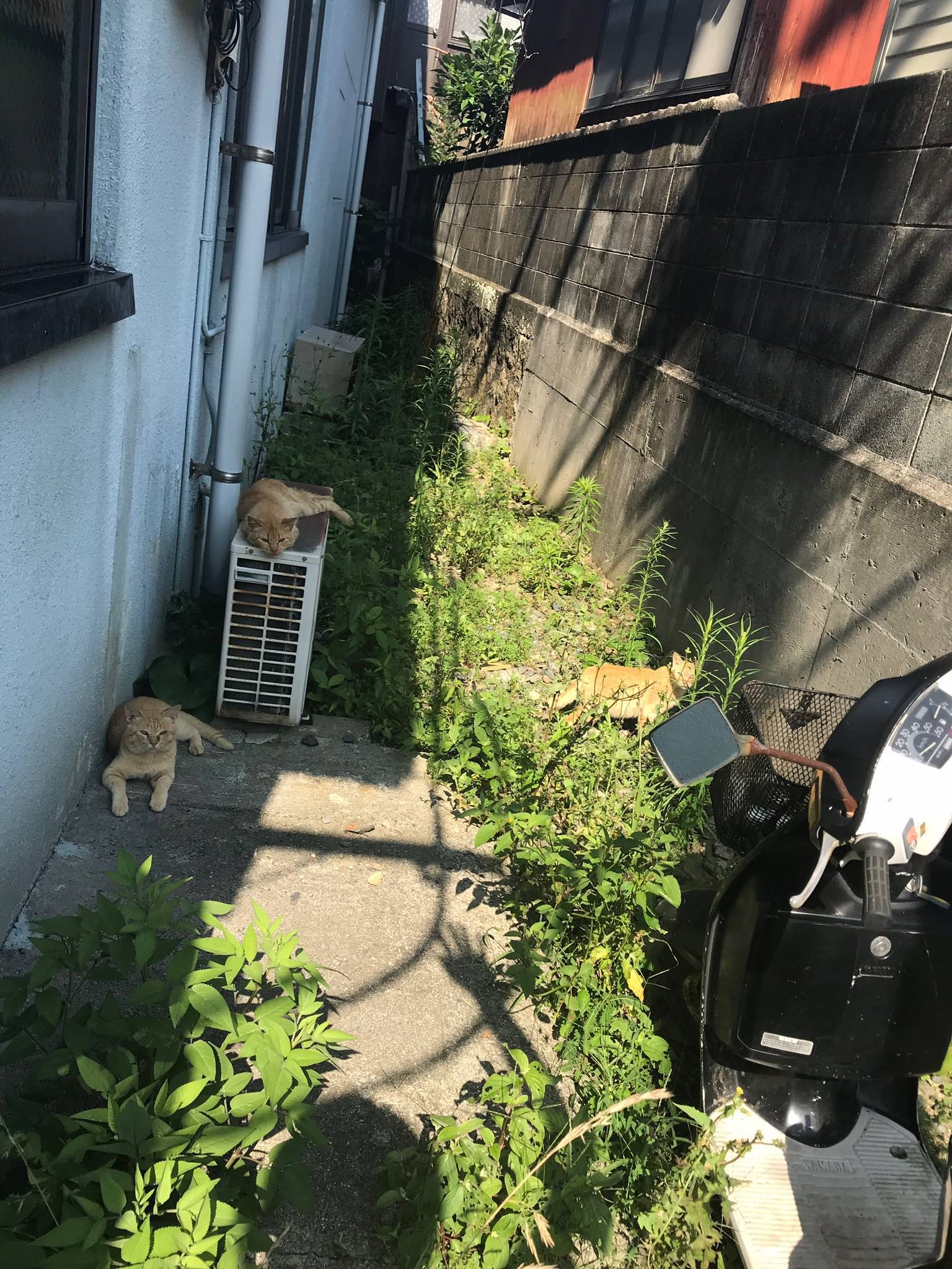 There is a resting place for cats near a bench just a short walk from the port. They seem to be hydrating with the water collected in the bucket there. You can see that they are fighting the heat in their own clever ways.