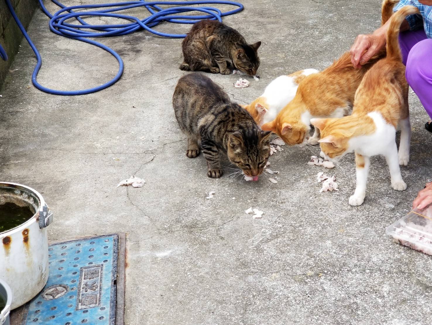 Cats who get rice from a local resident. Looking up at the grandmother who brought the rice, the cats seemed to say, "Hurry up! Give me more, now!"